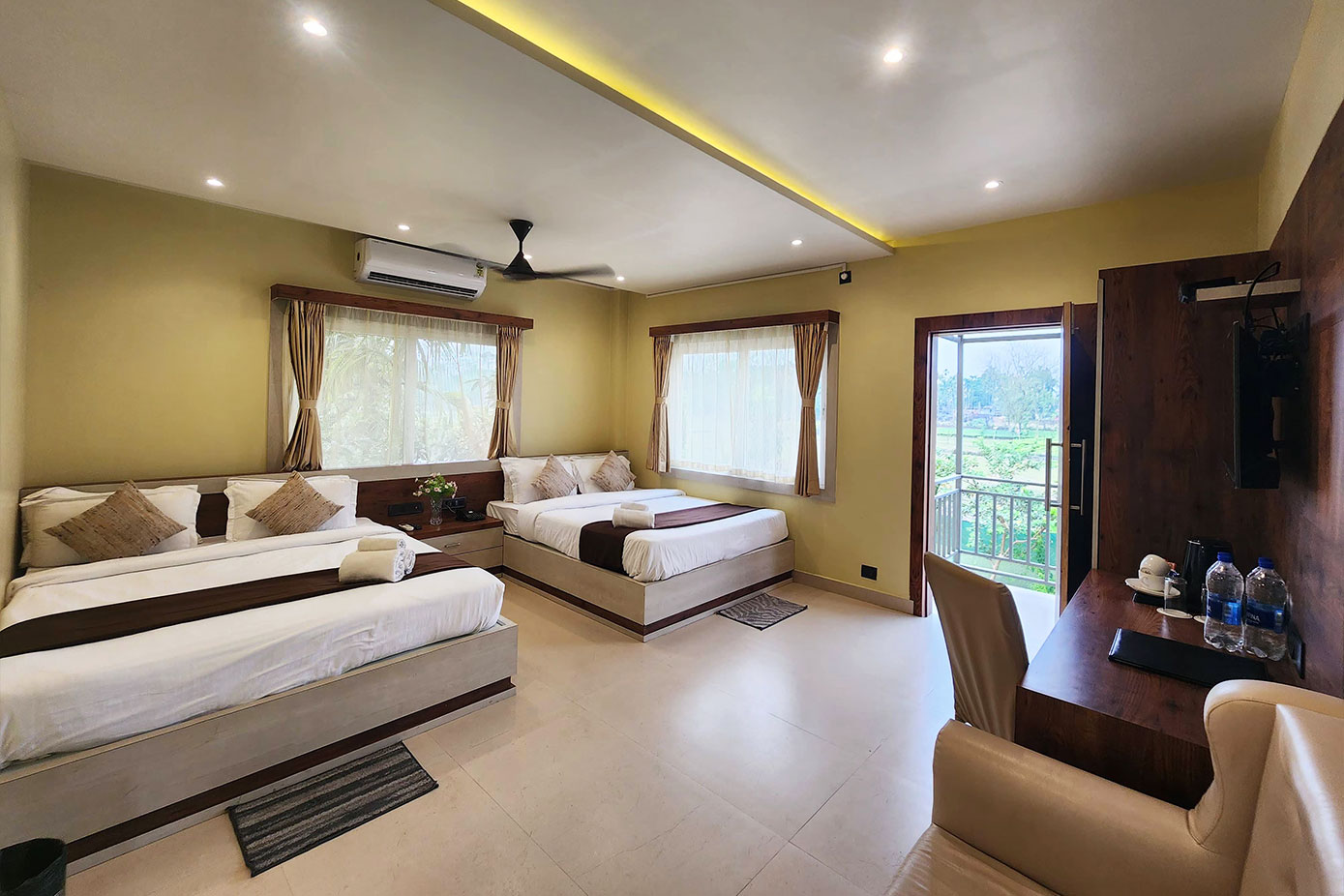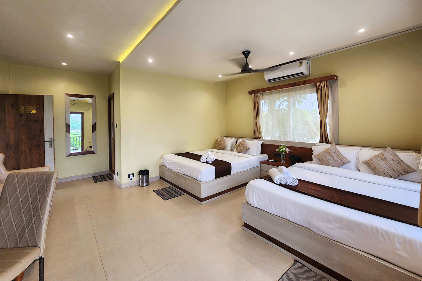 Ideal for guests holidaying with family, Family Suite in Oxytel is well-furnished, spacious & luxurious. These rooms have a perfect picturesque window that showcases the lush green forest & river Murti.